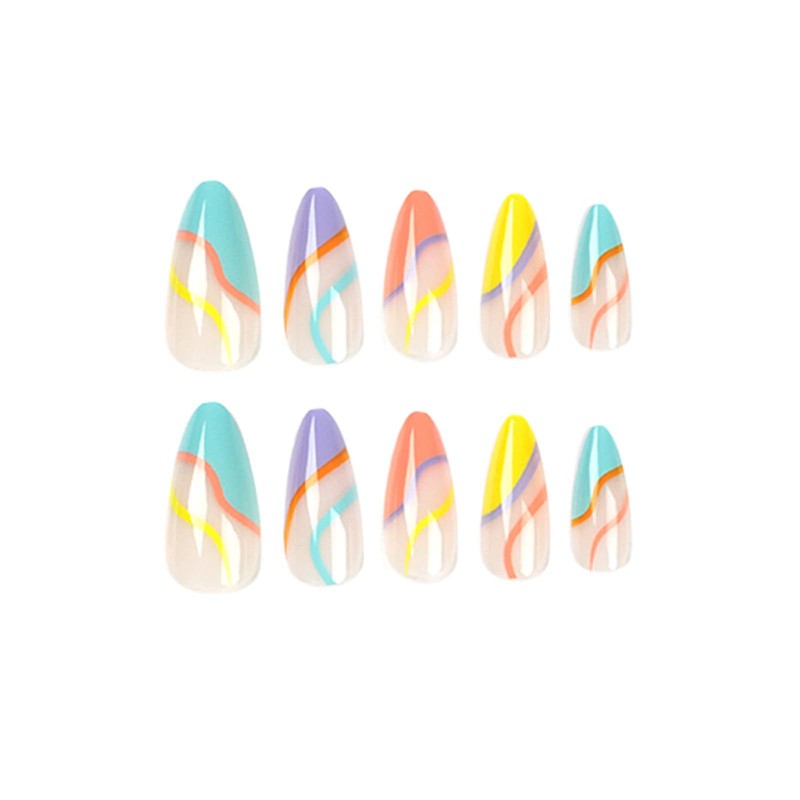 Justotry Pack of 24 Almond Glue-On Nails, Short, Multicoloured French False Nails, Swirl Oval Artificial Nails, Press-On Nails with Nail Glue, Acrylic Fingernails, Fake Nails for Women
