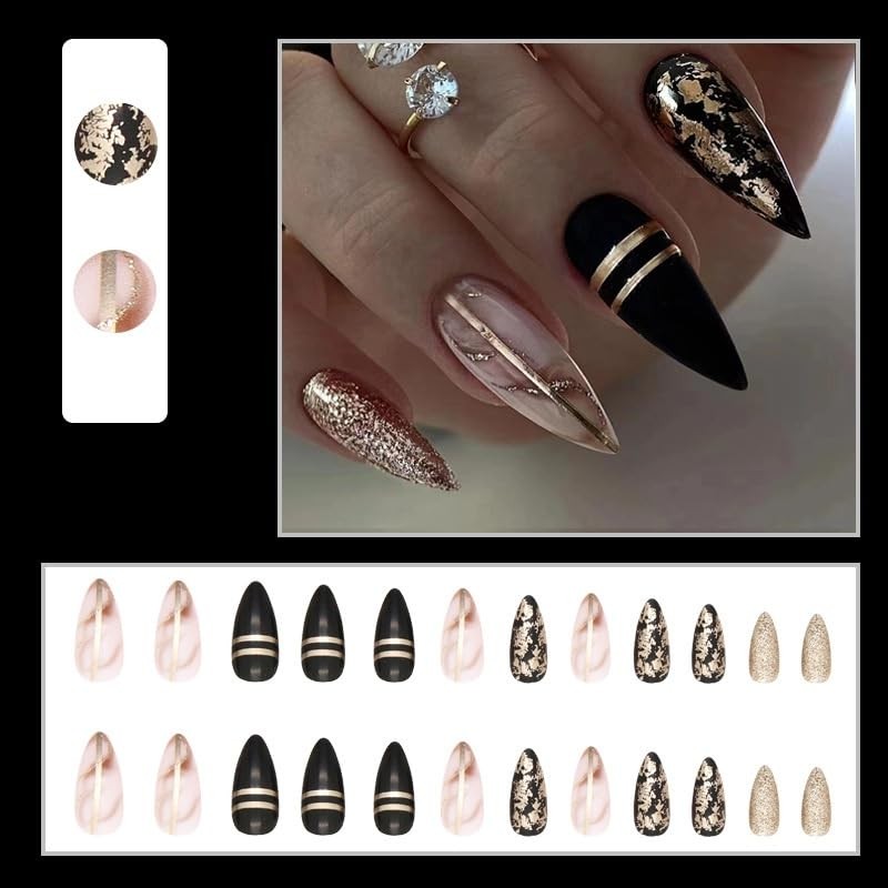 JUSTOTRY Pack of 24 Black Glue-On Nails, Short, Rose Gold Swirl Almond Press On Nails Pattern, Glossy Stiletto Artificial Nails, Fake Nails, Medium, French Fingernails, Artificial Nails for Women