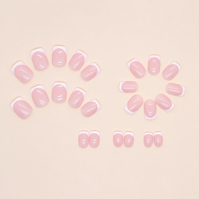 JUSTOTRY Pack of 24 Pink Nails for Gluing, Short, White Square, Press On Nails Pattern, Glossy Artificial Nails, Fake Nails, Medium, French Square Fingernails, Artificial Nails for Women