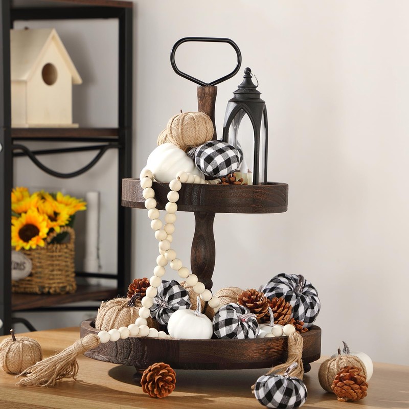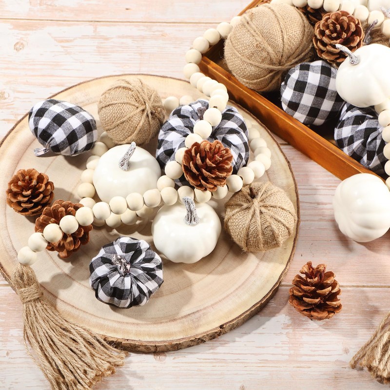 - Variety in Each Set: this artificial fake pumpkins decorative set includes 8 pcs white pumpkins, 8 pcs plaid cloth pumpkins, 8 pcs burlap pumpkins, 12 pcs natural pine cones, and a tassel wooden bead string; These diverse items offer you ample choices when decorating for fall themed events; Each piece brings a distinctive element, providing a richer tone to your decoration throughout the fall season