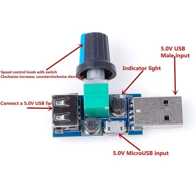 - Easy to Use: The USB fan controller is very easy to use. Connect your smartphone charger, power bank, computer USB and so on, insert the fan USB plug into the USB port of the governer, then turn the adjustment knob to adjust the volume of the large and small air flow. If you want to adjust the fan in 2 levels, just put the fan into one gear. Otherwise, the speed may not be adjusted