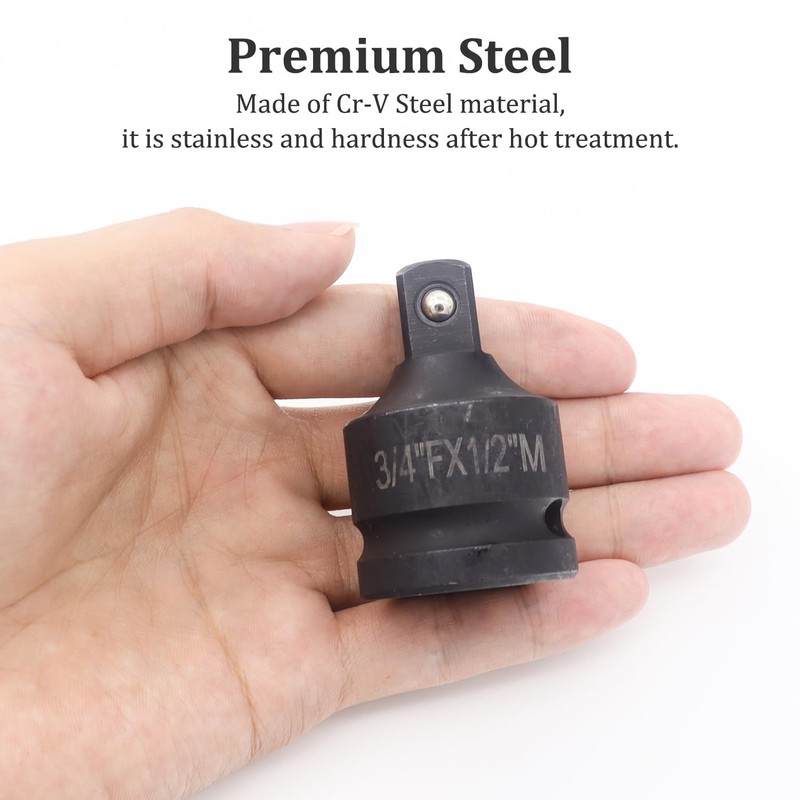 • Durable and Hard - The 3/4 to 1/2 inch reducer adapter is forged by Chrome Vanadium (CV) Steel material through heat-treated, which can reduce corrosion and has ultra-high hardness. The high density thickness withstands higher torque from impact tools and prevents breakage.