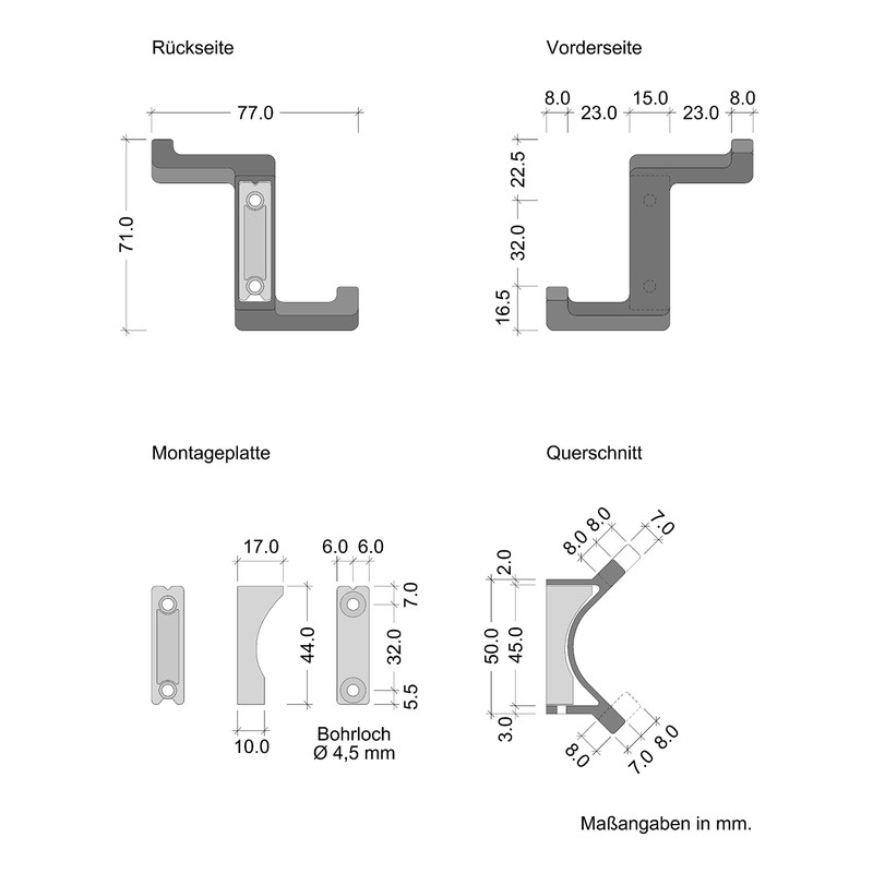 • Door coat hook square and curved with total height: 71 mm, width: 77 mm, hole spacing: 32 mm, material thickness: 8 mm, screw diameter: 4.5 mm