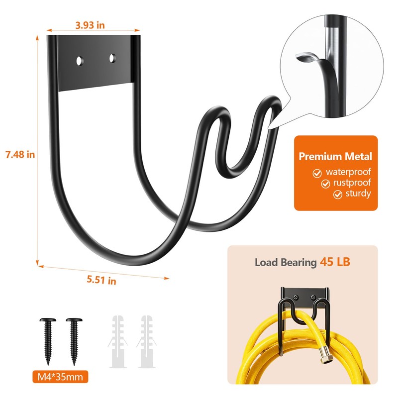 This heavy-duty metal garden hose holder wall mount provides a reliable solution for cluttered hoses. Crafted from corrosion-resistant alloy steel with protective coating, it withstands harsh weather while preventing rust.