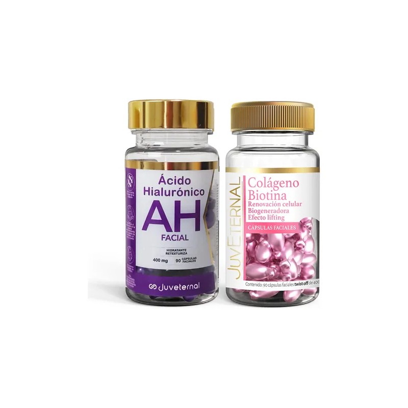 🌟 ⭐ JUVETERNAL Dúo Cápsulas Faciales Ácido Hialurónico + Cápsulas Faciales Colágeno Biotina, 90 cápsulas c/u, Hidratación, Elasticidad y Juventud para tu Piel ⭐ 🌟