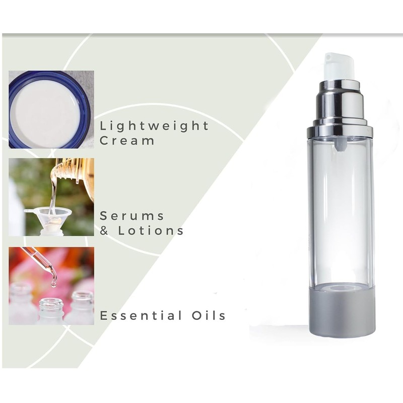 - Includes 1 - 1.7 oz / 50 ml Airless Pump Bottle