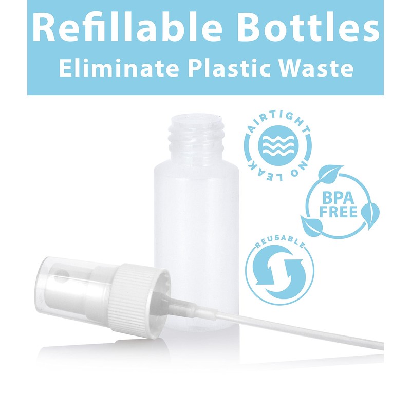 - SOLID CONSTRUCTION: Releases approximately 0.12-0.18 ml output of product per spray. Our fine mist spray closures also includes a clear plastic snap on over-cap to ensure your products do not leak or spill out in travel and transit.