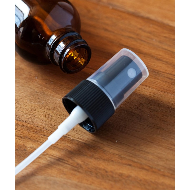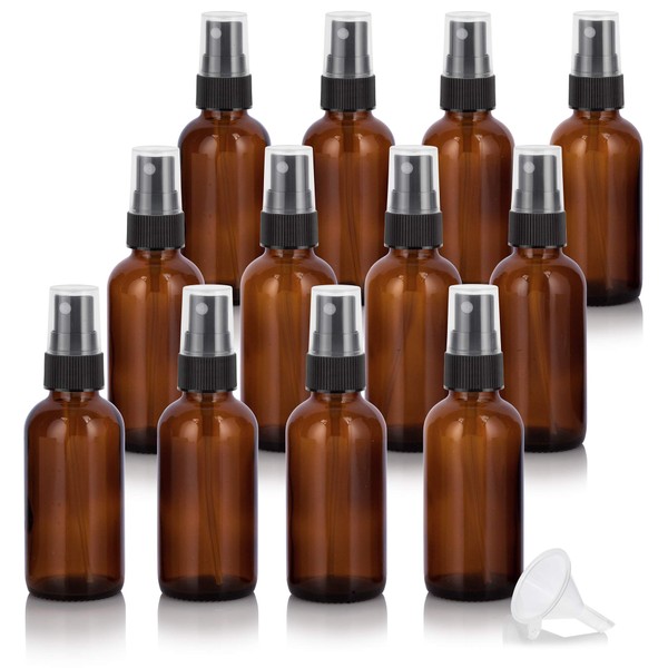 JUVITUS 2 oz / 60 ml Amber Glass Boston Round Bottle with Black Fine Mist Spray Atomizer (12 PACK) I Refillable Liquid Containers Includes Extra Phenolic Cap Closures for each bottle