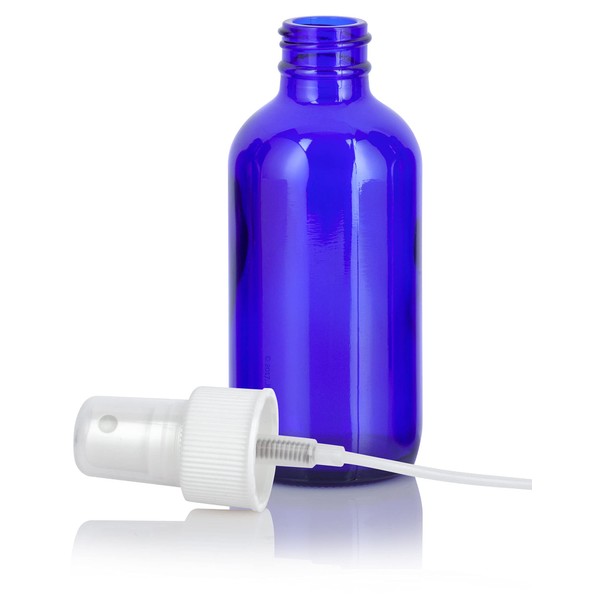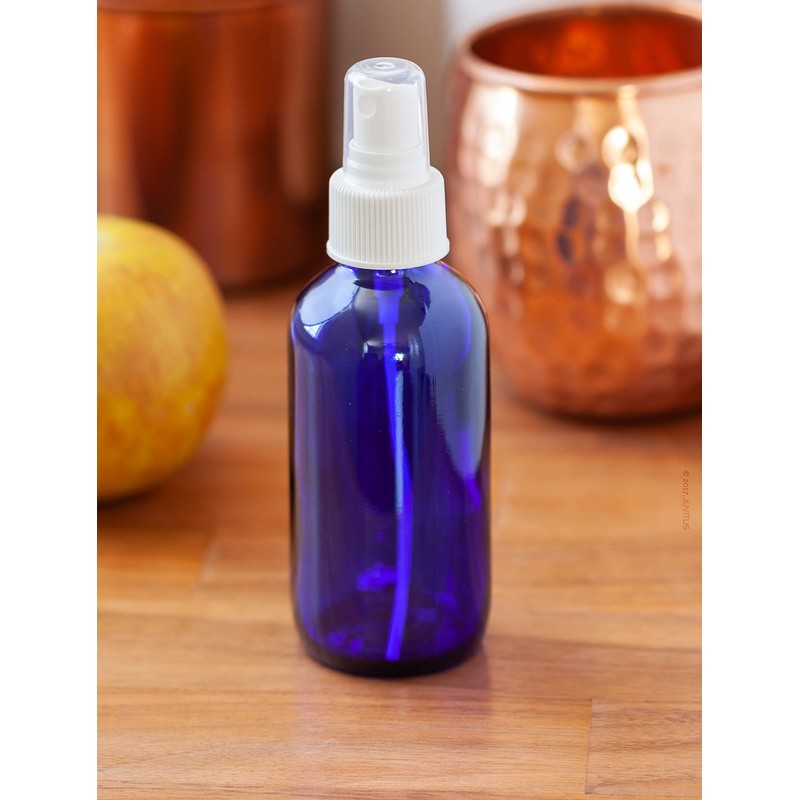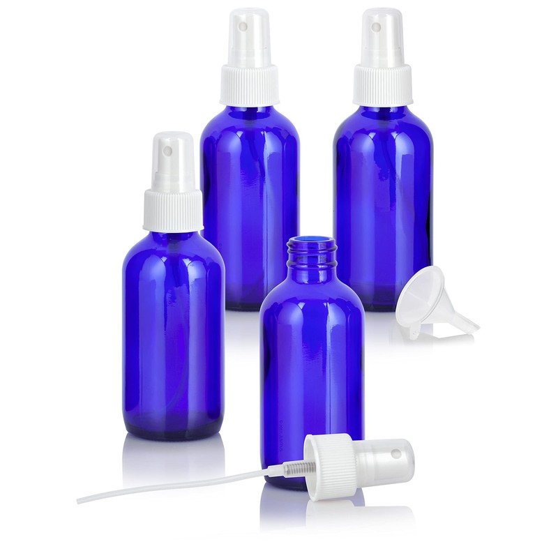 JUVITUS 4 oz Cobalt Blue Glass Boston Round Bottle with White Fine Mist Sprayer (4 pack) + Funnel I Refillable Empty Storage Containers