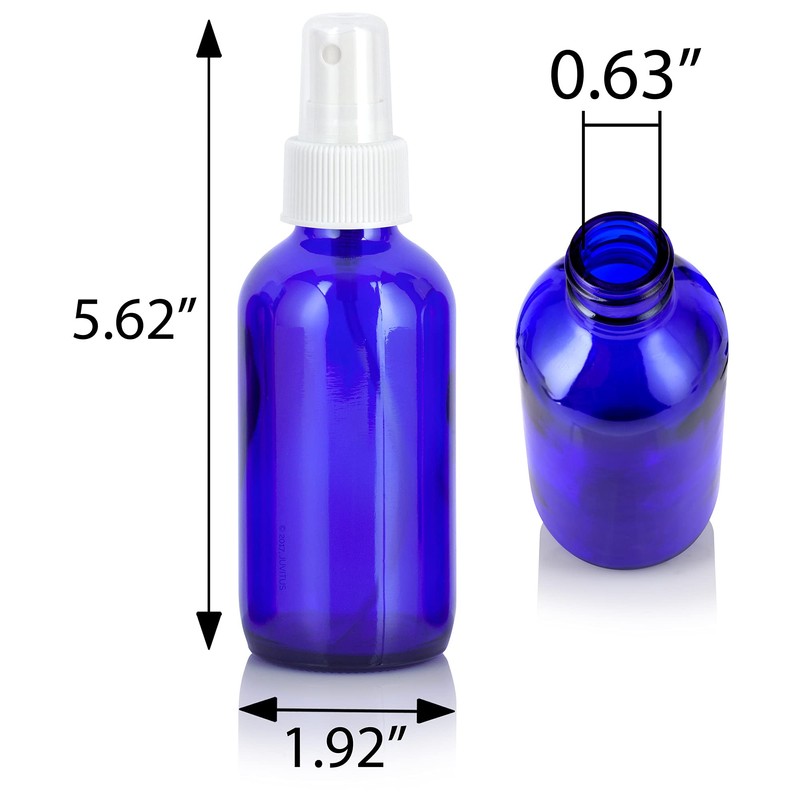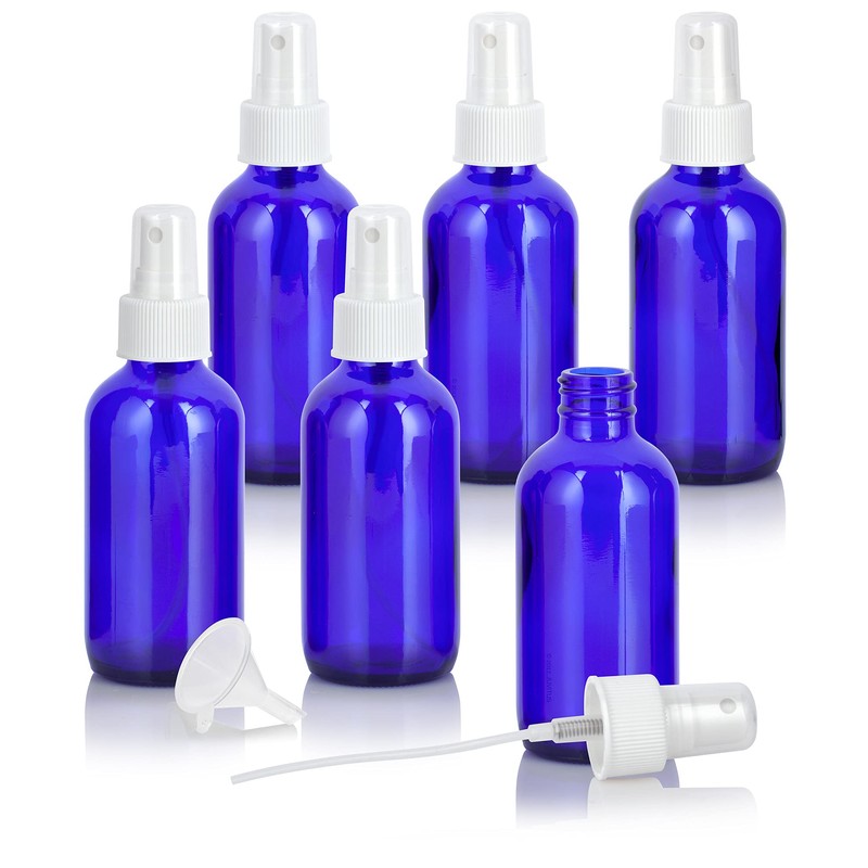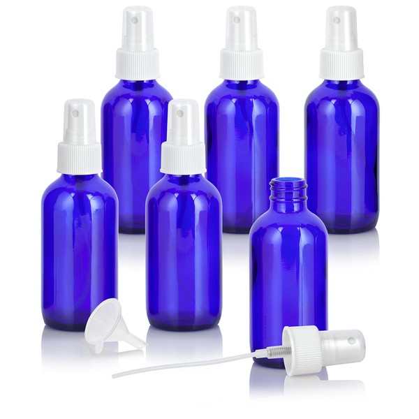 JUVITUS 4 oz Cobalt Blue Glass Boston Round Bottle with White Fine Mist Sprayer (6 pack) + Funnel I Refillable Empty Storage