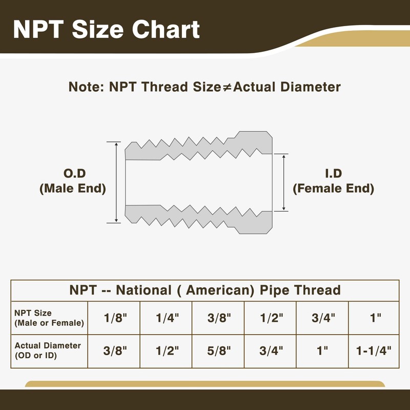 - High Compatibility: The JUWO NPT brass fitting is designed to connect pipes with different ends and is compatible with brass, bronze, copper, steel, aluminum, and iron pipes. Please note: The NPT thread size refers to the nominal pipe size and does not indicate the actual diameter. Check the size chart for the exact thread diameter.