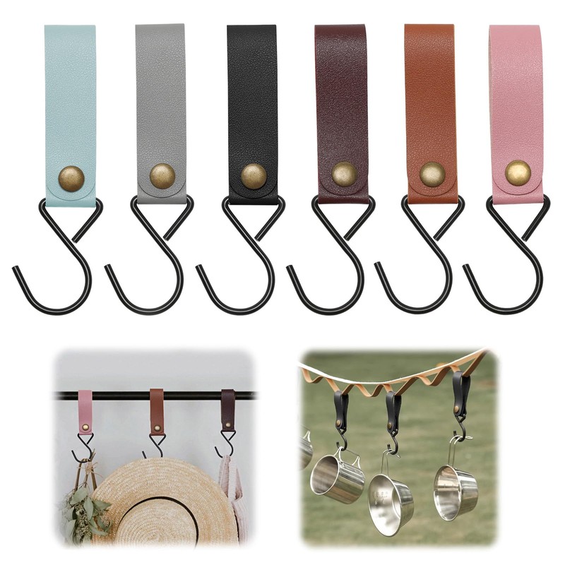 Juyibaao Pack of 6 Clothes Rail Hooks, S Camping Hooks with Leather Loop - S-shaped Multifunctional Metal & PU Leather Hooks for Kitchen, Bathroom, Backpack, Pushchair