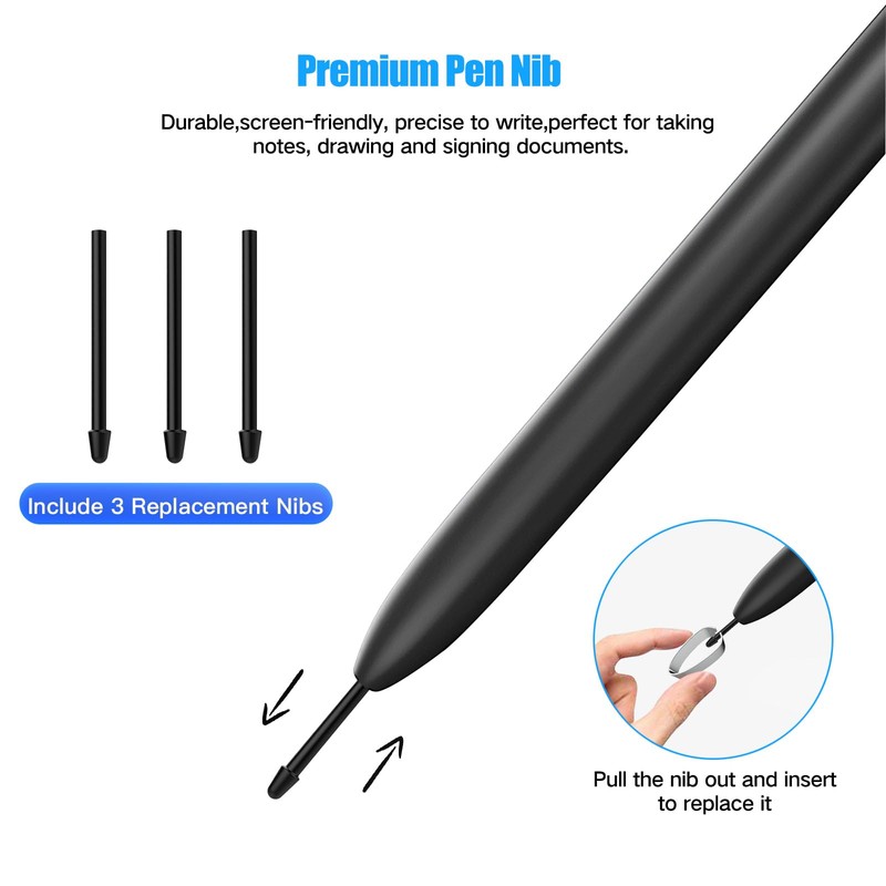 - Replacement Nibs&Pencil Holder: 3 replaceable nibs are made of high-quality ABS and PC material, which are not only du-rable but also screen-friendly. Comes with a pencil holderStrong adhesive keeps the pencil holder securely in placeholds your pen more securely, allowing you to grab or store the pen quickly and easily.Package Included: 1 x EMR Stylus, 3 x Replacement Nibs, 1 x Pencil Holder,1 x Pen Clip.