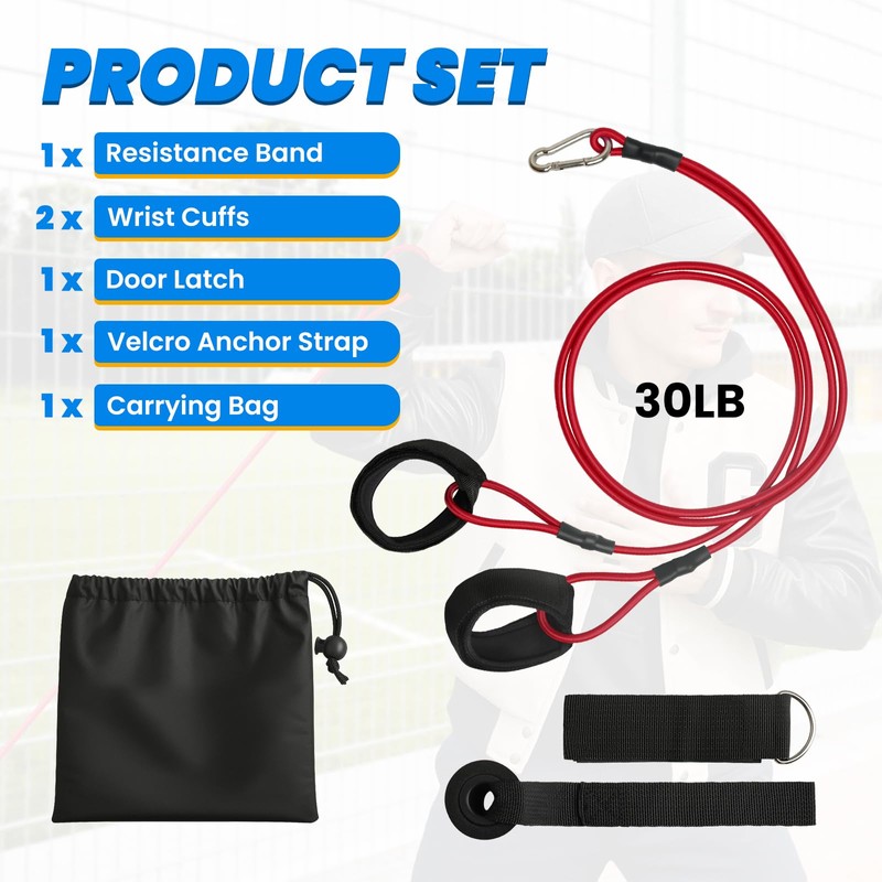 - 【GYM-TO-FIELD PORTABILITY】This kit includes 1 baseball arm band, 2 wrist cuffs, 1 velcro anchor strap, 1 door latch and carry bag. The carry bag is small and sturdy, and all training equipment can be easily placed in the bag and brought to any training ground. Keep your gear organized and ready for impromptu drills for daily commuter training or weekend games.