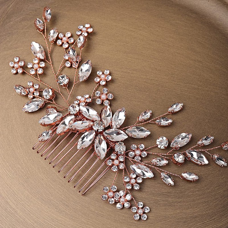 JWICOS Peine para el pelo hecho a mano con diamantes de imitación de flores para mujeres y niñas (oro rosa)