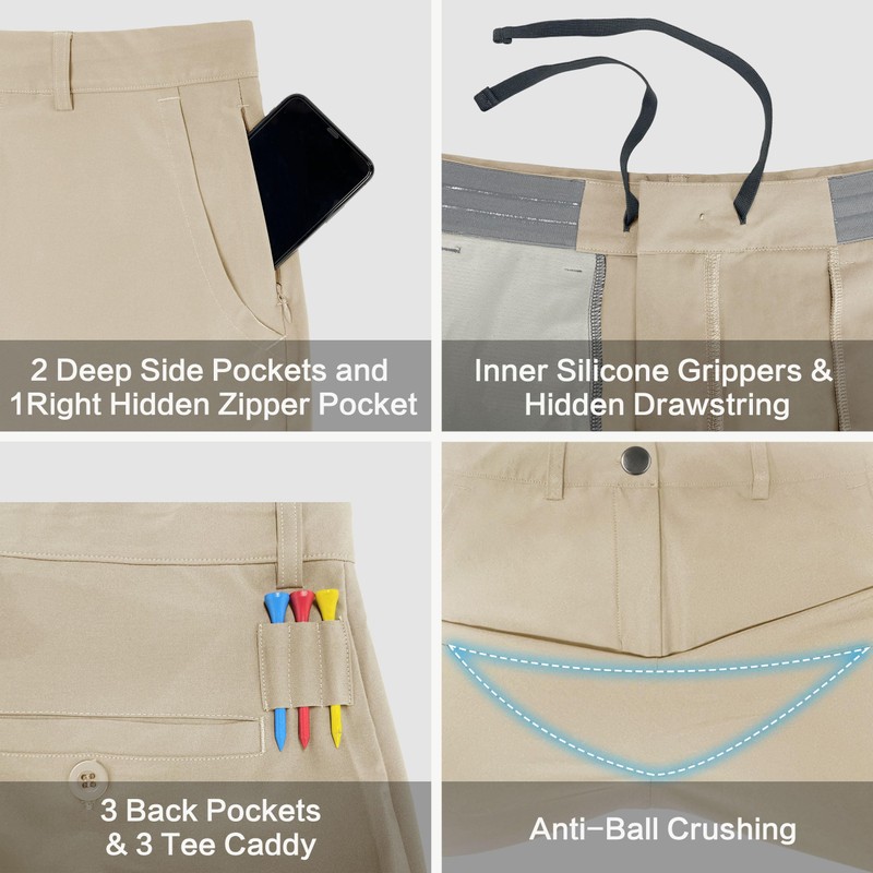 - 【5 Pockets & Tee Caddy】: 2 deep front pockets + left hidden zipper pocket + 2 button back pockets, you'll have plenty of space to store your belongings, and the tee caddy is located on the right hand side of the pants between the back and front pockets for easy access.