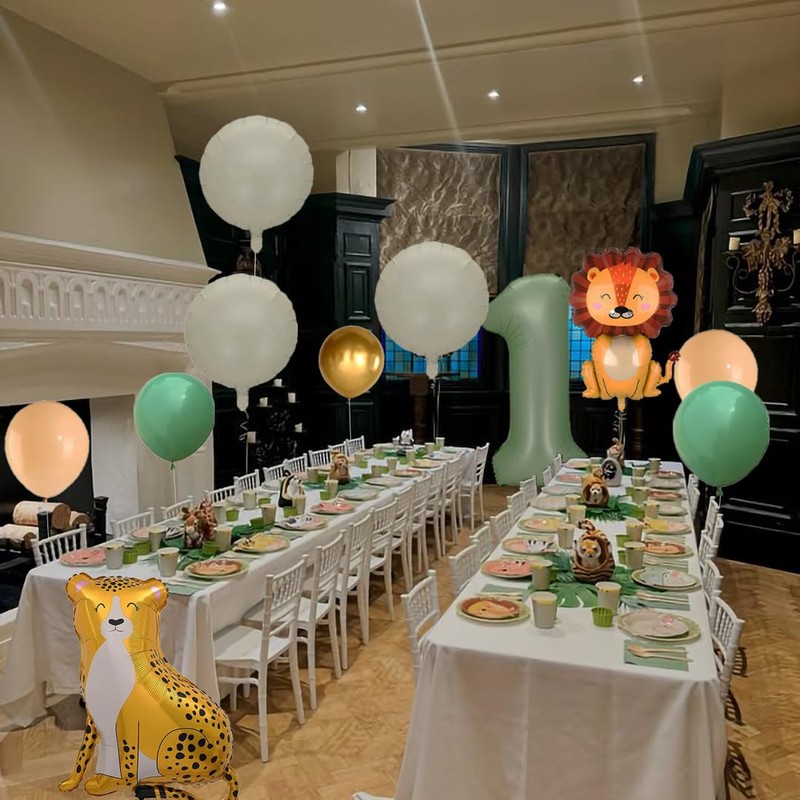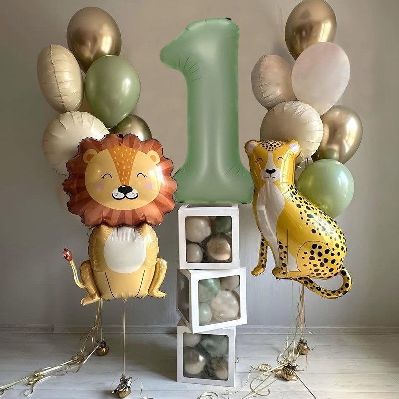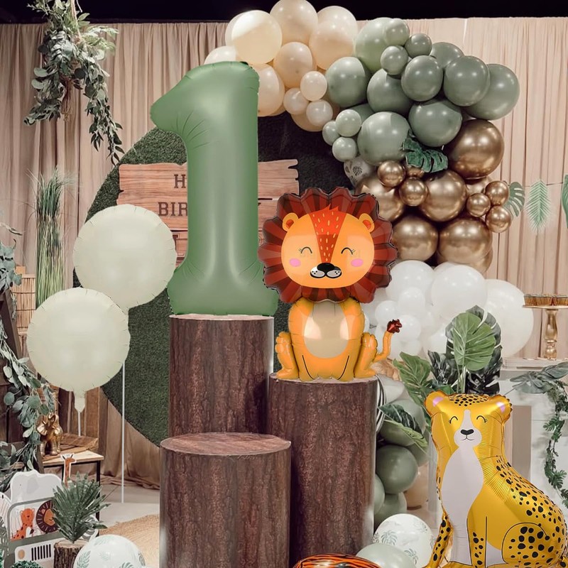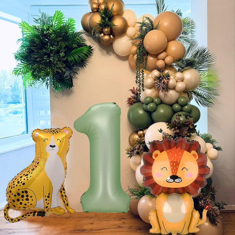 - Wild One Birthday:Include 1pc leopard foil balloon,1pc lion foil balloon,1pc 40inch number one balloon,4pcs 18inch circle sand white foil balloons,4pcs 12inch gold latex balloons,2pcs 12inch sage green balloons,2pcs 12inch sand white latex balloons.