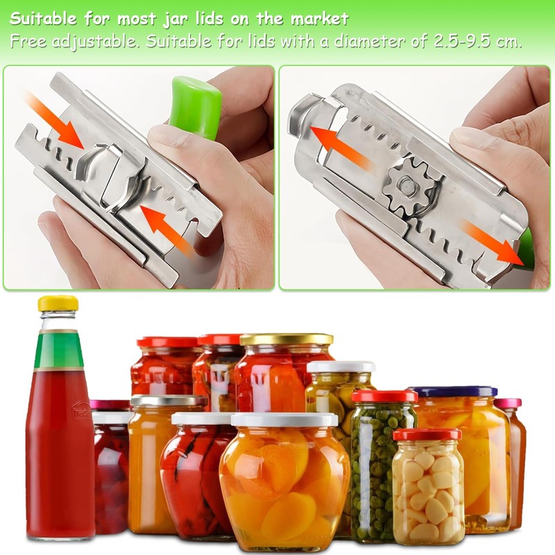 - Adjustable arthritis jar opener: a total of 2 jar openers, screw lid openers, green. Suitable for bottle caps with a diameter of 2.5 - 9.5 cm, easy to open different bottle caps. Effortless and convenient, the stainless steel can opener is the perfect gift for female friends!