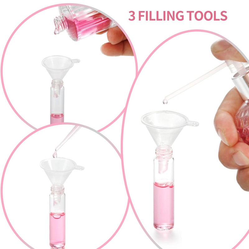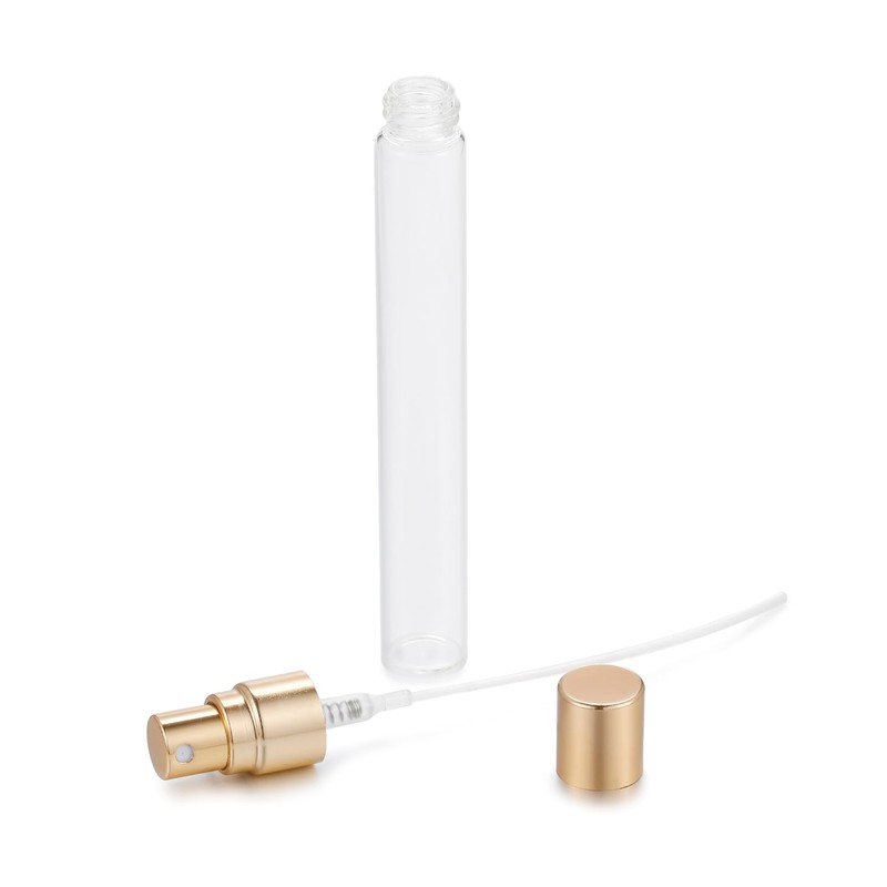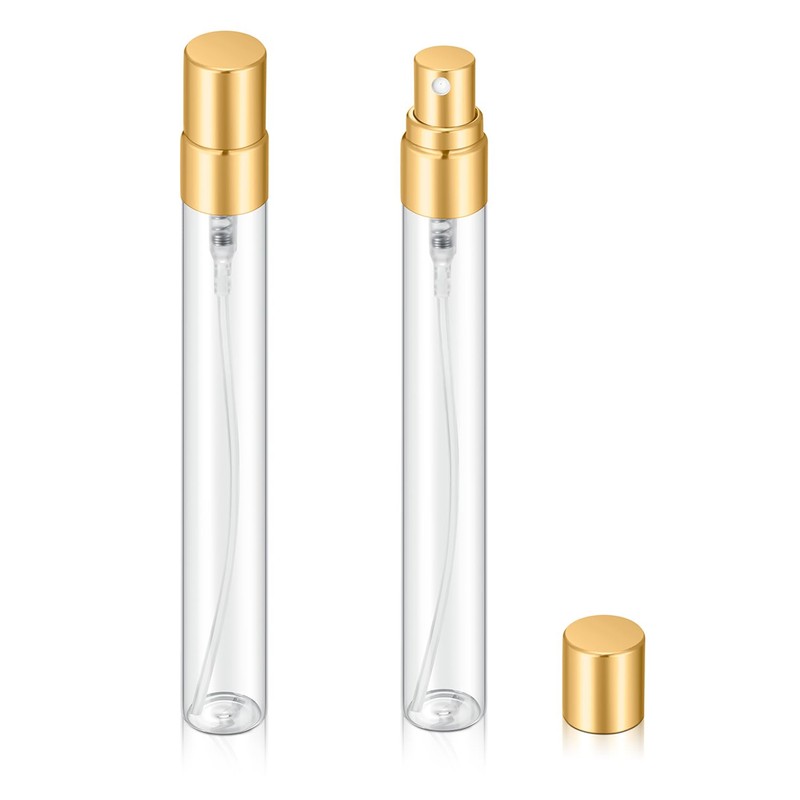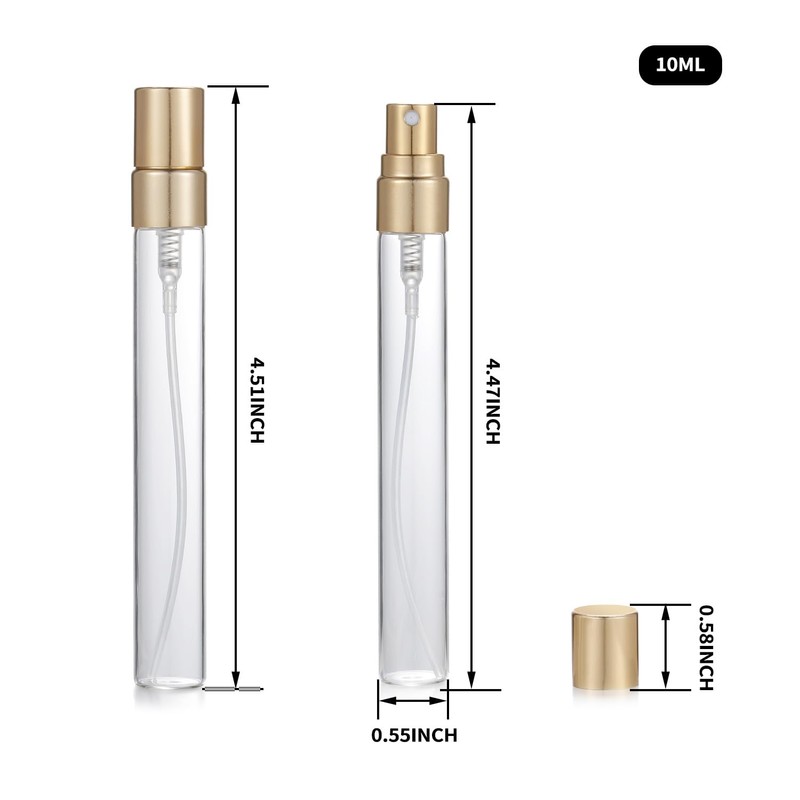 • 【Package included】: 20pcs perfume Mist spray bottles ,2 pcs plastic funnels, 2 pcs Droppers,2pc pressure pump transmission tools; Bottle Capacity:10ml/0.34oz;Size:4.51inch*0.55inch(Height*Diameter);Color:Transparent bottle body+Golden anodized aluminum nozzle and lid