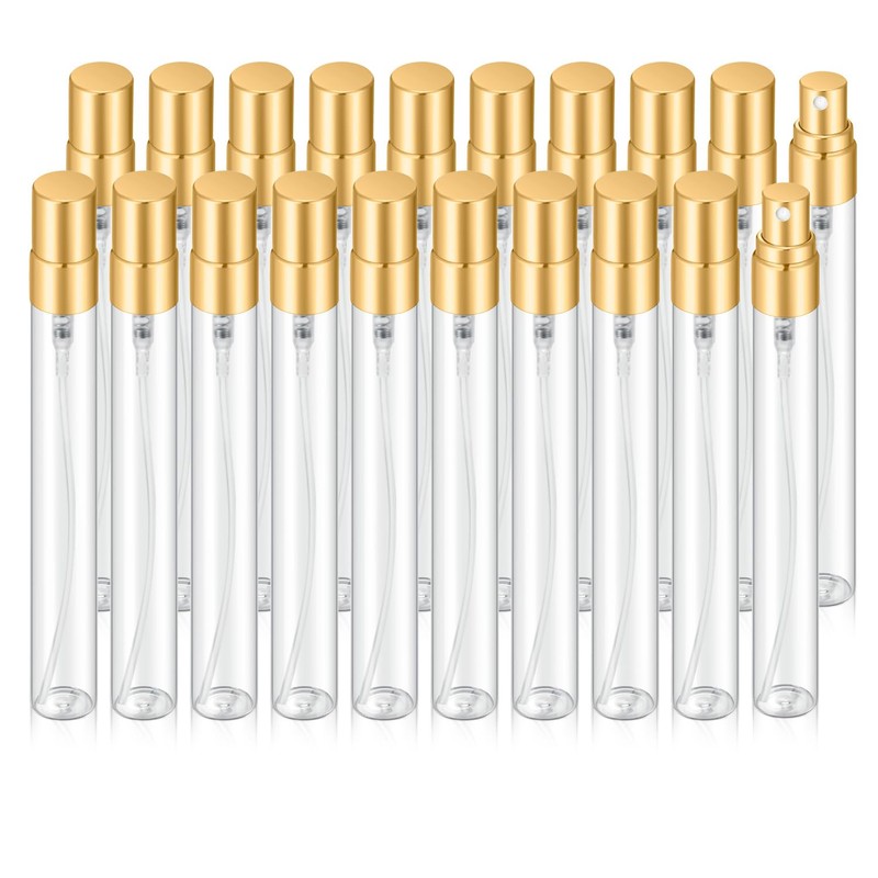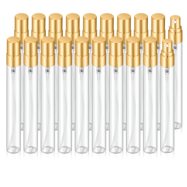 Jxcmeng 20Pcs 10ml Empty Clear Glass Mist Spray Bottle Refillable Mini Perfume Atomizer Travel Sample Bottle with Golden Aluminized Nozzle Makeup Container for Perfume (10ml Gold Caps)