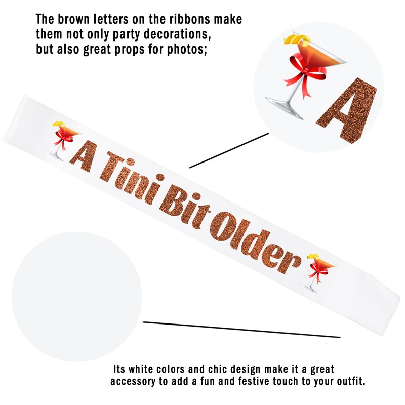 - Martini Birthday Party Decorations: Package including 1 pcs white martini birthday sash with brown lettering 'A Tini Bit Older'. It’s a great gift for martini themed ceremony and party, coffee bean party, cocktail theme party! This sash is the perfect accessory for many types of events