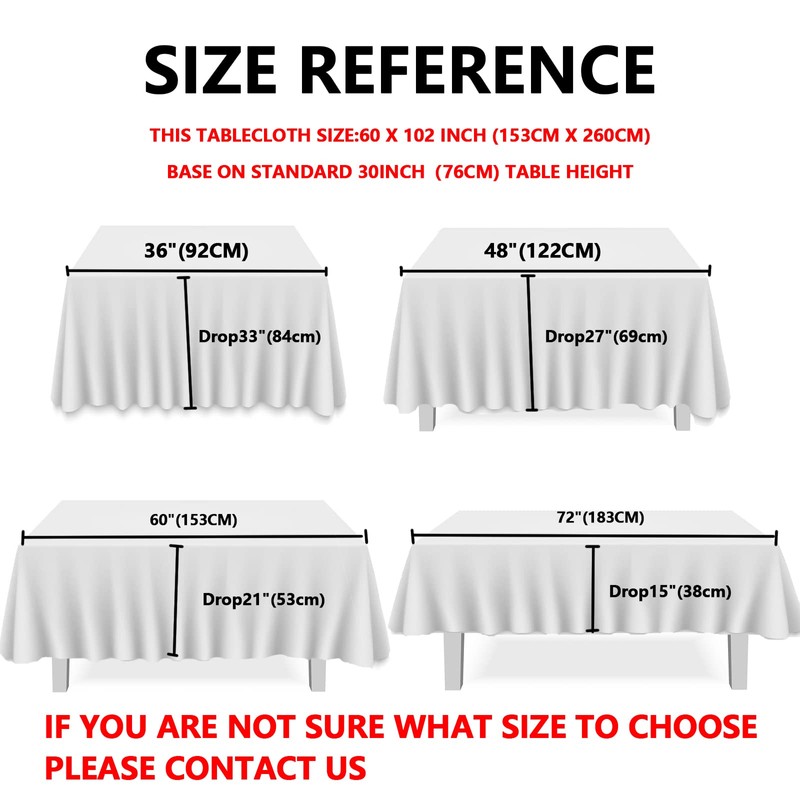 - About Size:All size is refer to the tablecloth size,we recommend choosing a tablecloth that is at least 30 inches larger than your table, if you are not sure, you can contact our professional customer service for help