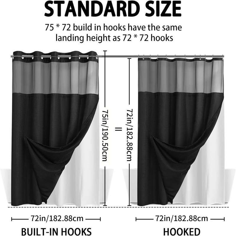 - 【Standard Size】This standard shower curtain measuring 71"W x 74"L(same size as 71"Wx72"L hooked shower curtain) and comes with a 71"W x 54"L snap-off liner.Fits many standard size shower/tub and works with straight or curved shower rods.
