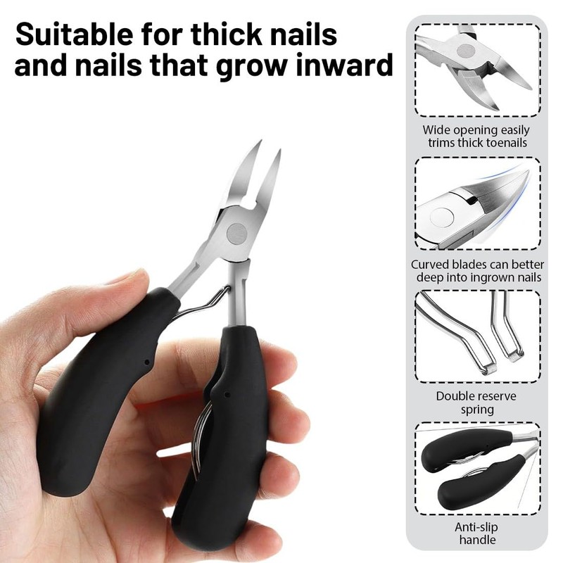 • FUSSPFLEGE-NAGELSCHERE: Die für ältere Menschen mit dicken und eingewachsenen Nägeln entwickelten,um 25 Grad gebogenen Klingen passen sich der Krümmung des Nagels an und dringen tief in die Nagelrillen ein, um eingewachsene Nägel und scharfe Kanten präzise zu bearbeiten.Die Nagelknipser für dicke Nägel verfügen über rutschfeste PP-Griffe,die ergonomisch für einen bequemen und festen Griff gestaltet sind.Die doppelten Federn in den Griffen verlängern die Lebensdauer des Nagelknipsers erheblich.