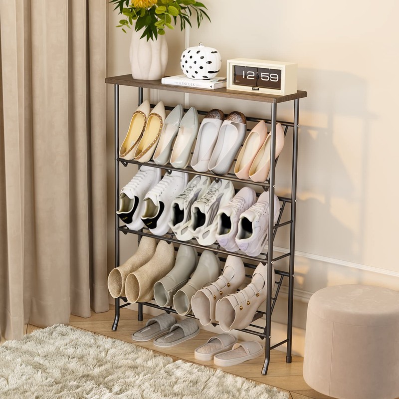 - LARGE SHOE RACK: 4 tier Shoe Storage Organizer with 3 metal mesh shelves providing large space to store up to 12-16 pairs of shoes,offer you plenty of space for your families to store their shoes and top wood layer can be used to place bags, keys, picture frames, flowers,etc