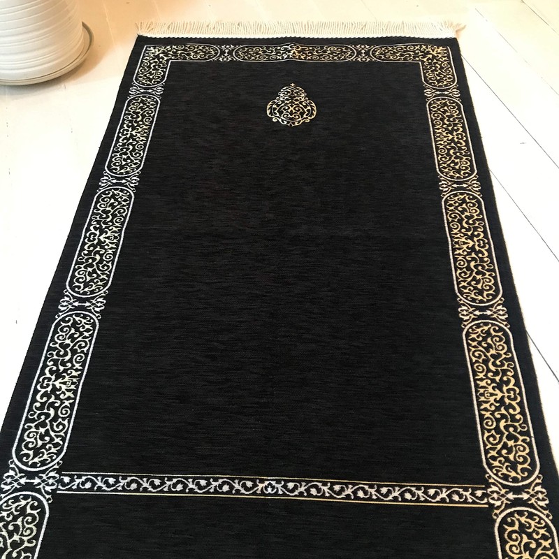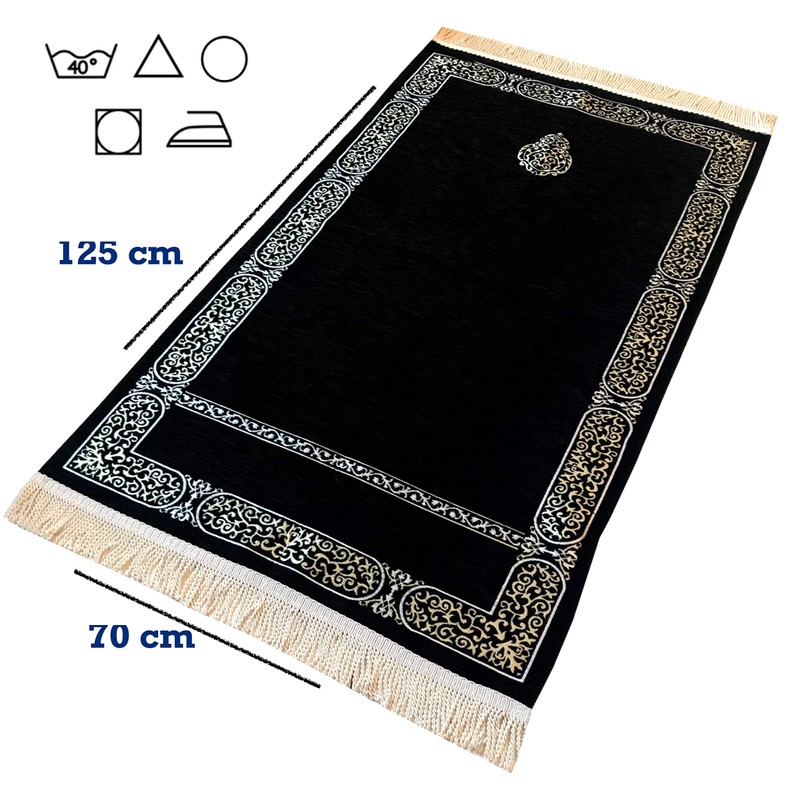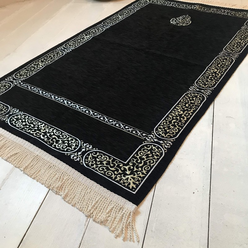 K'ba Pattern Prayer Rug | Large Size Muslim Prayer Mat | Chenille Embroidered Woven Janamaz - Size: 125 x 70 cm | Black