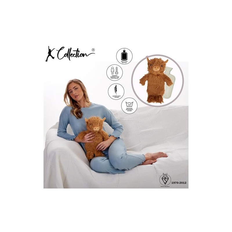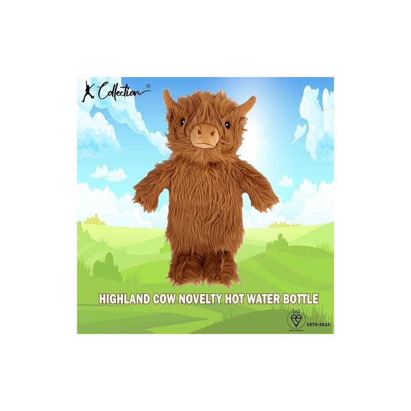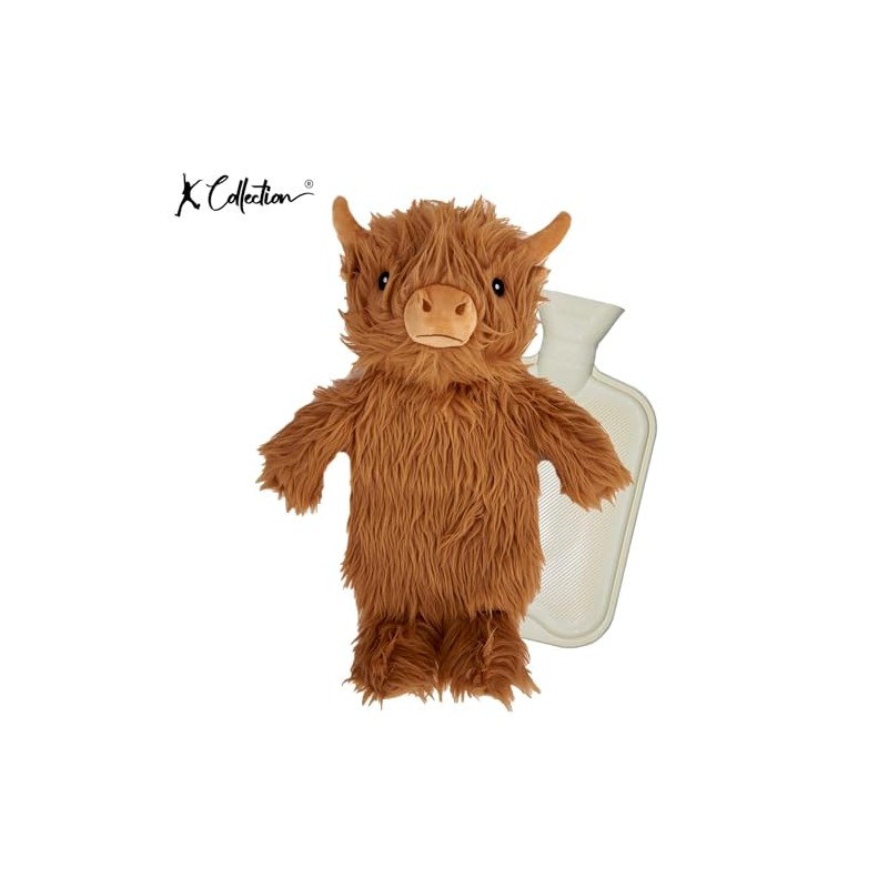 - NOVELTY HIGHLAND COW HWB: Experience Toasty Warmth and Quirky Charm with K Collection's Hot Water Bottle in a Highland Cow Disguise! Our hot water bottle, snugly tucked inside an endearing plush highland cow cover, comes to life with lifelike horns, legs, and more. Not only does it provide comforting warmth, but it also adds a touch of whimsical character to your cozy moments. Indulge in the perfect blend of function and fun with our unique highland cow-themed hot water bottle