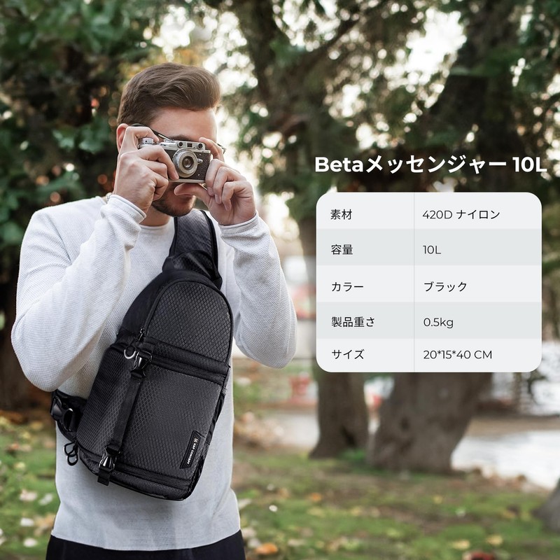 - ■【10L大容量カメラショルダーバッグ】サイズ:33cm ×22cm×15cm、容量:10L、重さ:約500g。カメラ本体1機 、交換用レンズ2本を収納可能です。携帯電話や財布、モバイルバッテリーなどのデジタルアクセサリー用のスペースがあります。
