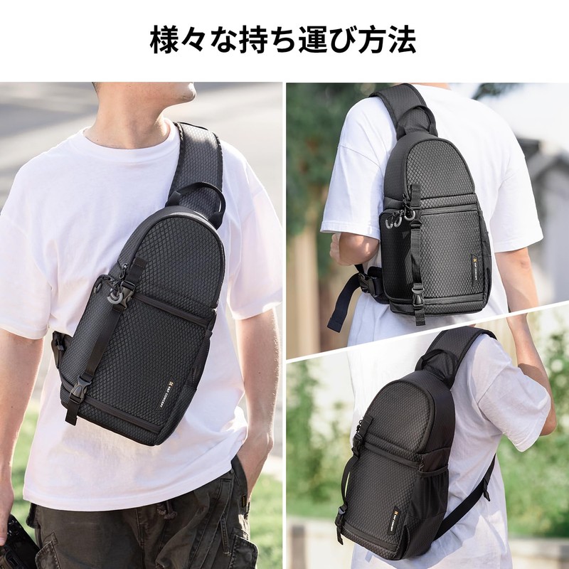- ■【防水素材・盗難防止】カメラバッグは100%撥水ナイロン、補強縫糸、盗難防止ファスナーで作られています。耐傷性、耐摩耗性のデザイン、プロの撮影機器を収納でき、10mmの高密度EPE防振綿を内蔵し、撮影器材を全方位的に効果的に保護できる。