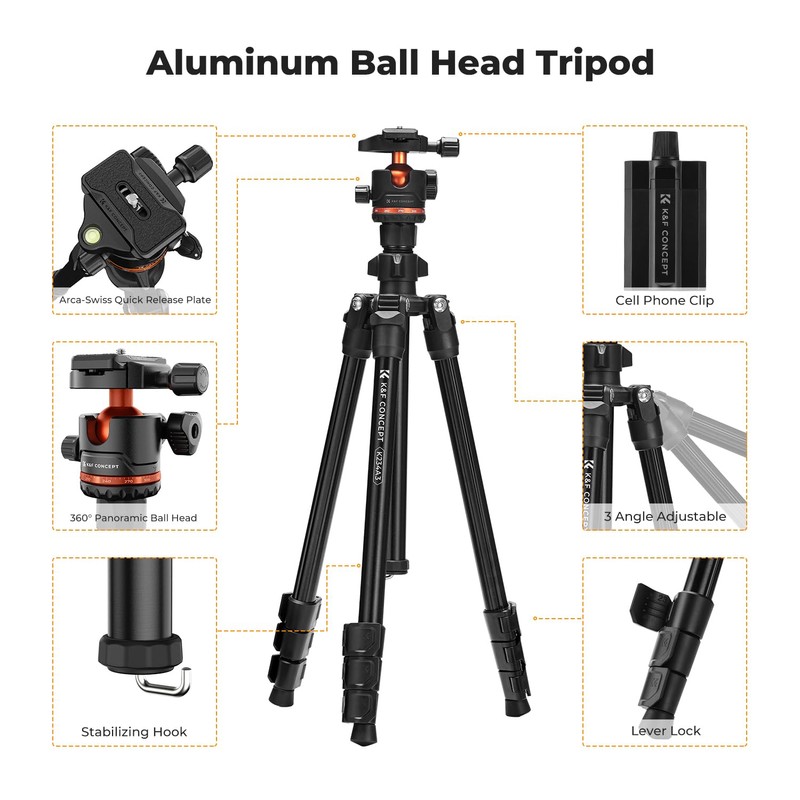 K&F Concept 70 inch/178cm Camera Tripod, Lightweight Travel Tripods for Camera with 360 Degree Ball Head Load Capacity 8kg/17.6lbs, Cellphone Clip for Smartphone Live Streaming Vlog K234A3+BH-36
