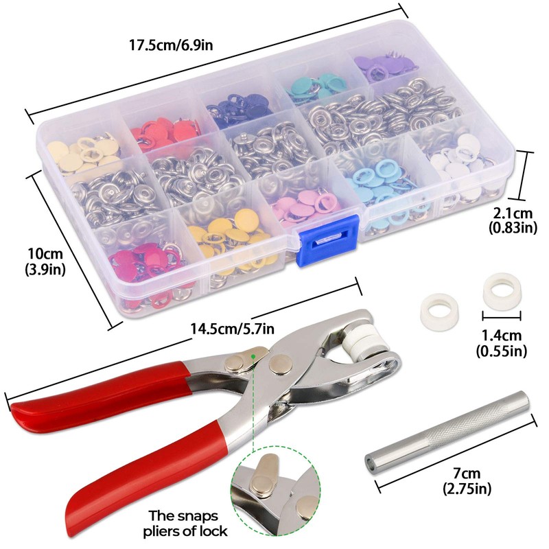 • ♫ [804Pcs Snaps for Sewing] Snap fastener tool contains 1 Snap Pliers + 800pcs(200 Set) 9.5mm(3/8”) colorful prong ring + 2 spare rubber + 1 punching tool. Snaps for clothing, perfect for most thinner sewing fabrics. Much more firm and solider, wider applicability.