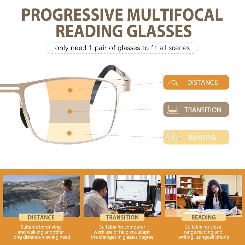 - UV Protection & Blue Light Blocking: These reading glasses and sunglasses block and protect blue light and harmful UV rays. This means your delicate eyes are effectively protected when you're outdoors or using electronics. Progressive lenses allow you to read, see distance, and see near objects without changing glasses, making them ideal for everyday use and preventing eye fatigue.