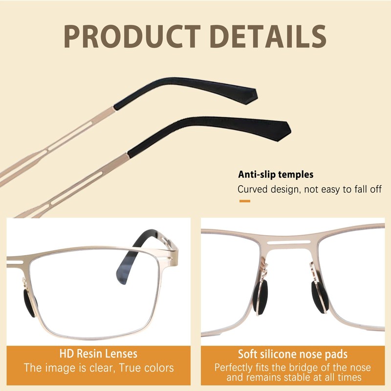 - Men's progressive glasses that open 25° outward: metal spring hinges are combined with black/gold square metal frames, and the temples are non-slip and fashionable. The silicone nose pads are transparent, elastic and comfortable to wear. Transparent lenses and progressive reading glasses with natural transition and no image jump make life more convenient.