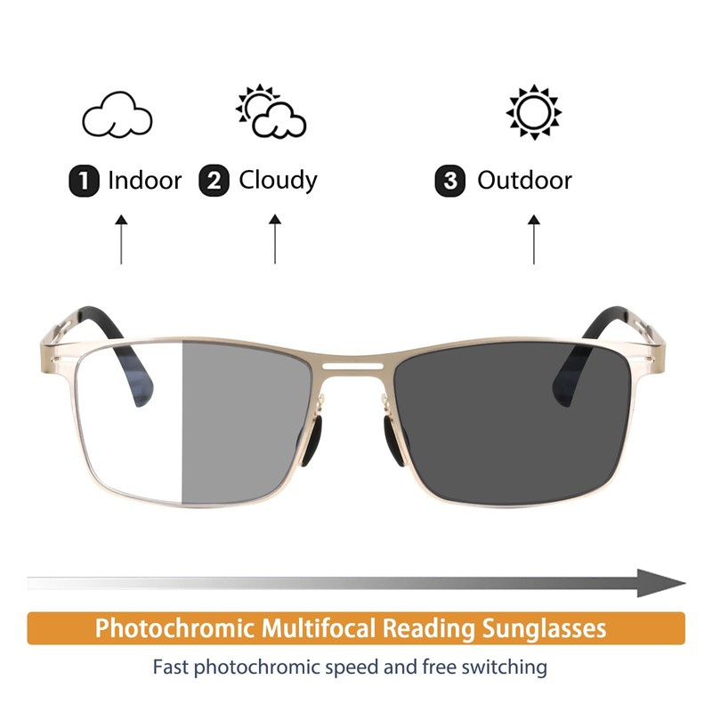 - Progressive color reading glasses can automatically adapt to different light conditions and do not need to be replaced frequently. Men's progressive photochromic glasses darken in sunlight and lighten indoors. Whether reading or admiring distant views, photochromic readers provide clear and comfortable vision. These transitional round reading glasses for men and women make your life more convenient and your vision more comfortable.
