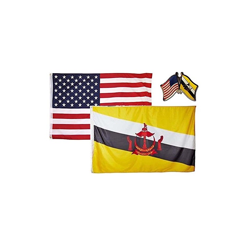 K's Novelties Set of 2 Flags with Matching Friendship Crossed Pin USA & Brunei Country 3x5 3’x5’ Flag & Lapel Pin