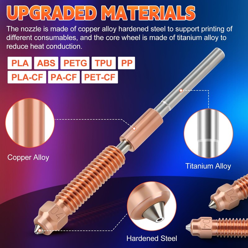 • High speed printing: chrome zirconium copper nozzles heat up quickly, provide even heat conduction and allow stable material flow at high printing speeds. The hardened steel structure ensures long-lasting performance, fluid printing and precise layer quality even under intensive use, ideal for demanding 3D printing projects.