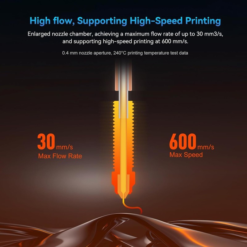 - 【High Flow, supporting High-Speed Printing】Enlarged nozzle chamber, achieving a maximum flow rate of up to 32 mm³/s, and supporting high-speed printing at 600 mm/s