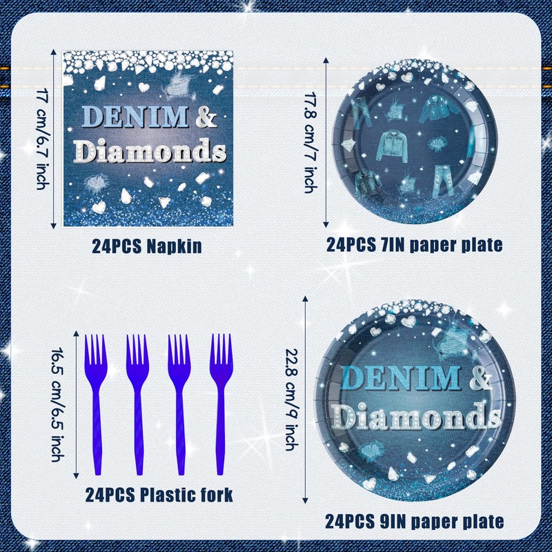 K1tpde Denim and Diamonds Party Tableware - 96PCS Denim Theme Jacket Jeans Tableware Set Included Paper Plates Napkins and Forks, Crystal Birthday Party Supplies for Bachelorette Wedding Decor, 24 Set