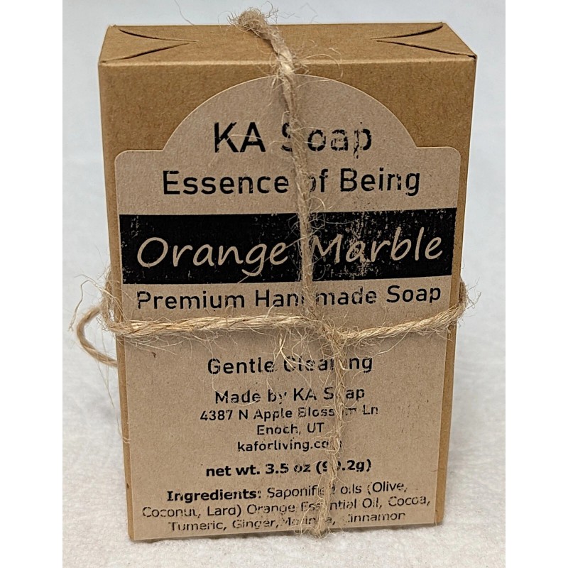 KA Soap's "Orange Marble" is a premium, handmade soap bar.  The complex marble design is made from Dutch Process Cocoa Powder, Turmeric Powder, Ginger Powder, Moringa Powder, and Cinnamon Powder. This enticing color design gives the soap its name. This soap bar is lightly scented with  Orange essential oil.