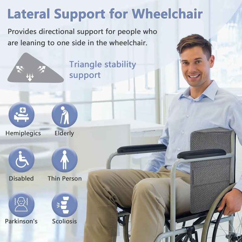 - 【Multi-scene Use】The dimensions of the lateral support for wheelchair is 14.3”×7.87”×5.11”, can be placed in wheelchairs, senior chairs, and even standard chairs with armrests and beds. Suitable for Hemiplegics, Parkinson's, Scoliosis and elderly people sitting in wheelchair for extended periods of time.