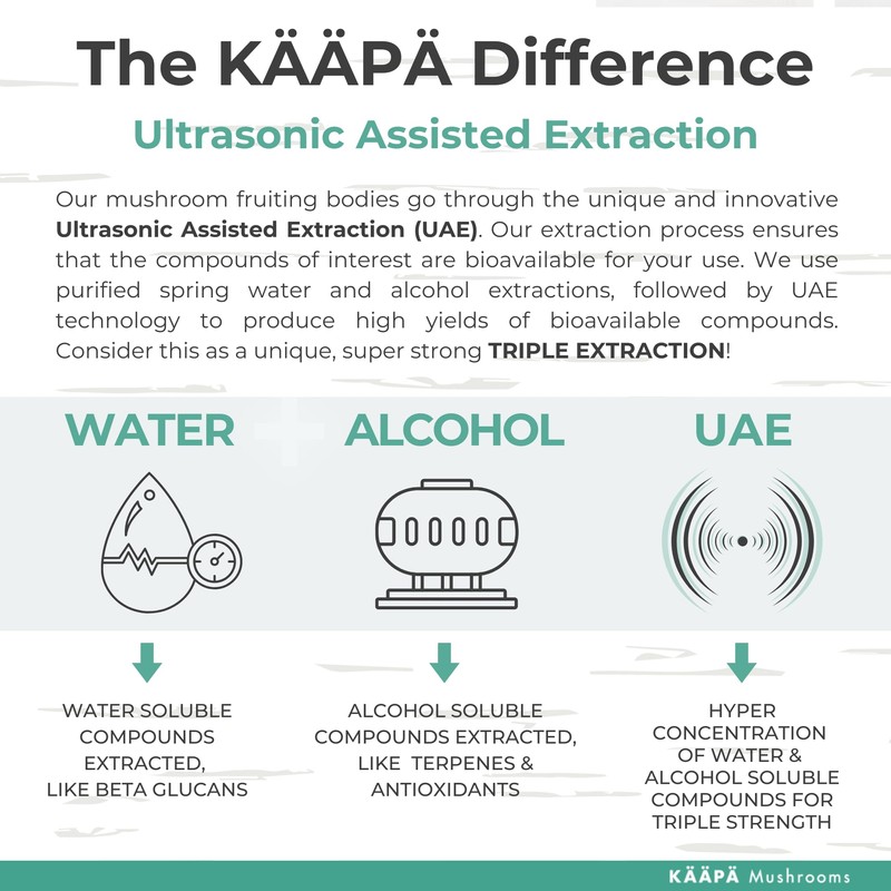 • EXTREME PURITY: At KÄÄPÄ, we have a dedicated research facility where we study the growing conditions of each mushroom to maximise the content of beneficial compounds. We oversee every step of the process, from spore to bottle, in our lab and growing facilities, to create truly exceptional products. Additionally, we conduct third-party lab tests for heavy metals and contaminants to ensure safety and quality.