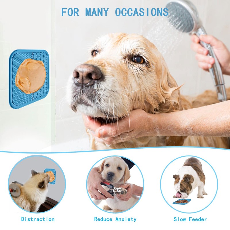 -Versatile: Our lick mat is suitable for various kinds of food, like peanut butter, fruit puree, pumpkin, yogurt, small kibble or pet snacks with chicken and veggies. It's also helpful in various situations like during baths, grooming, nail clippings, vet visits, thunderstorms, and fireworks to reduce pet stress. When you're not around, put snacks on the lick mat to keep pets occupied and reduce boredom.