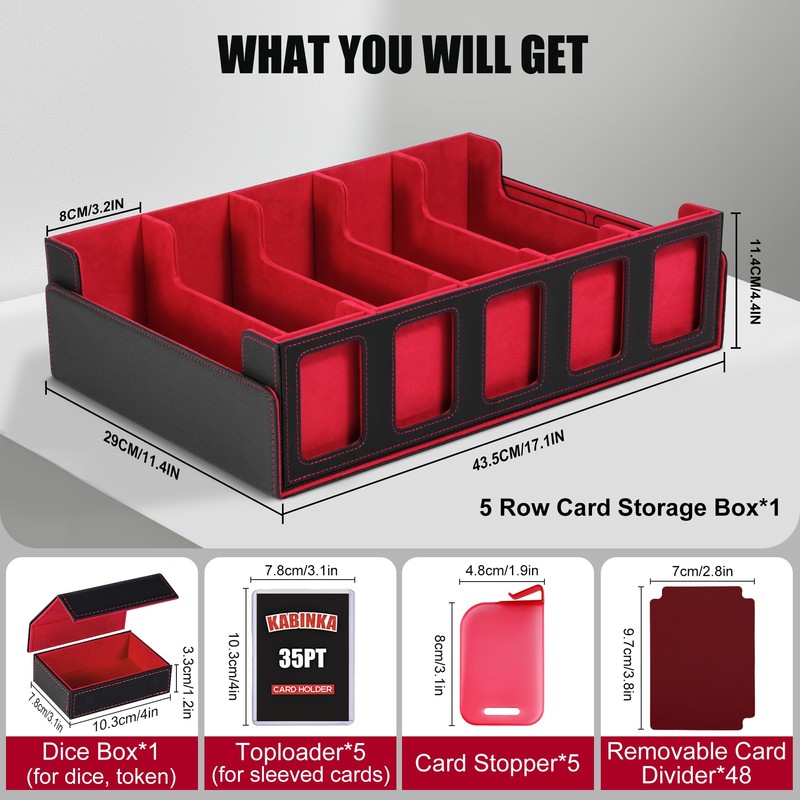 Kabinka Trading Card Storage Box with Commander Display, 5-Row Deck Case with Removable Lid; 3900+ Card Deck Box for MTG TCG Sports Card, 5 Toploaders, 5 Stoppers, 48 Dividers,1 Dice Tray (Black Red)