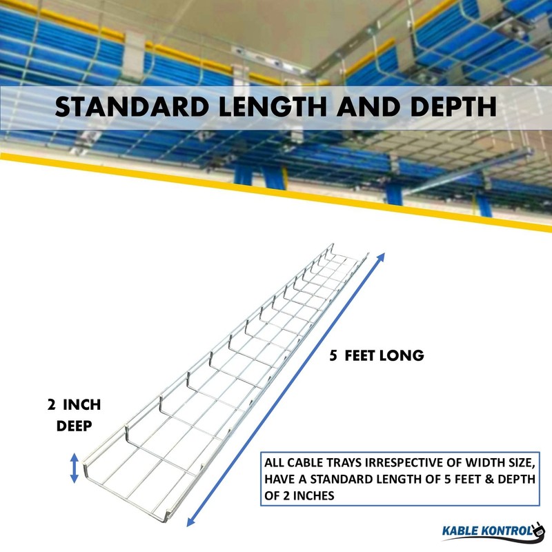 - SPECS – Cable Tray Straight Section | Width: 4” Inch (101.6mm) | Length: 5’ Feet | Depth: 2” Inch (mm) | Color – Chrome | Material – Zinc Plated Steel