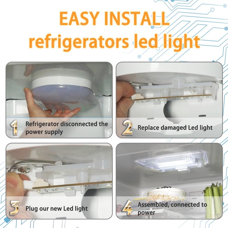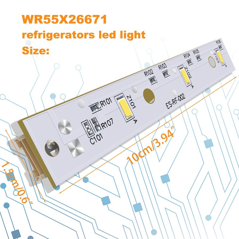 - EASY INSTALLATION: WR55X26671 led light board refrigerators led light is very easy to install. Simply remove the refrigerator light cover, take out the damaged WR55X26671 LED light panel, insert the new light panel, and reattach the light cover. The entire process takes less than 3 minutes, saving you from costly repairs and giving your replacement refrigerators led light a new look.