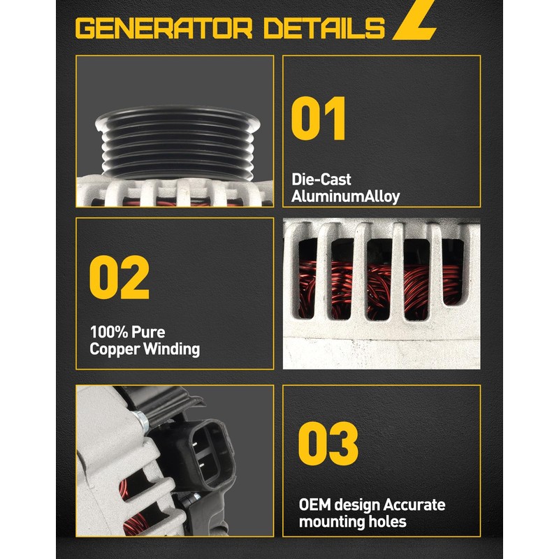 • 🚗[OEM Standards]: Through insulation performance and noise testing, our high Amp alternator ensure compliance with safety electrical standards and deliver low-noise operation. Enjoy a quiet & comfortable experience. Precise inspection of appearance and dimensions ensures a perfect match for your vehicle.